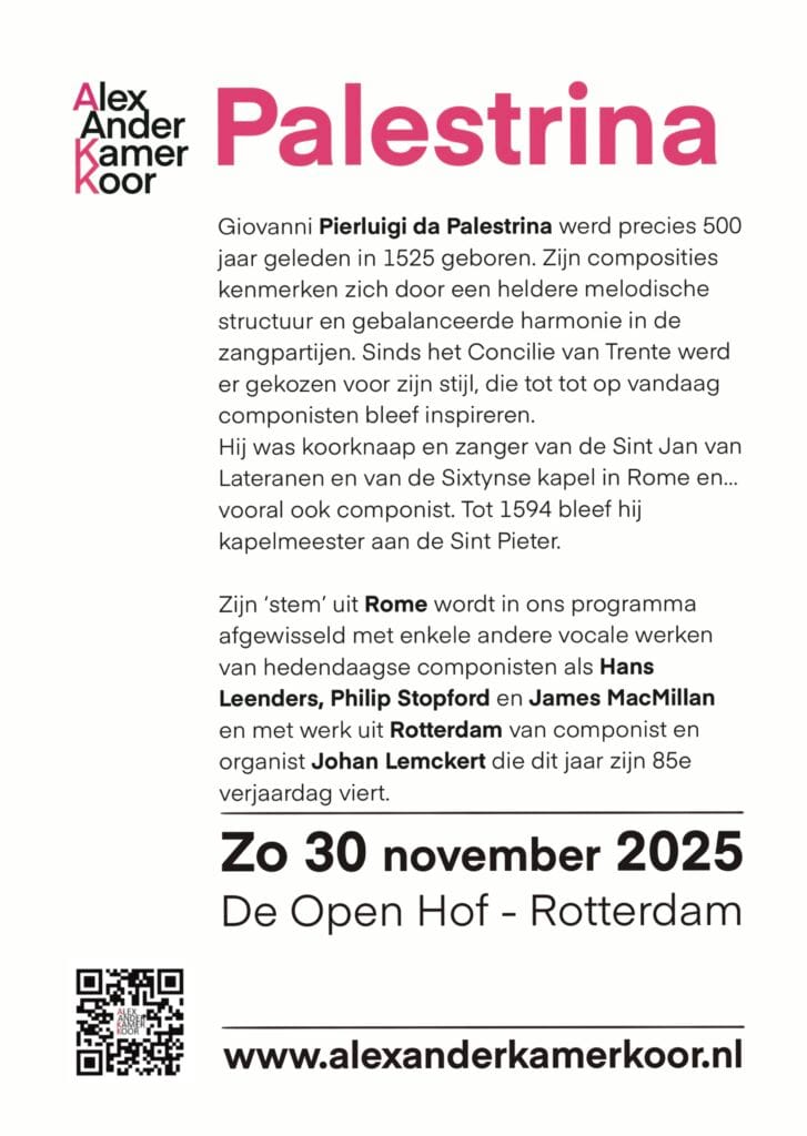 Het Alexander Kamerkoor is een Rotterdams Kamerkoor met ambitie, eigenzinnige muziekkeuze, vernieuwend, en we zingen met Passie.